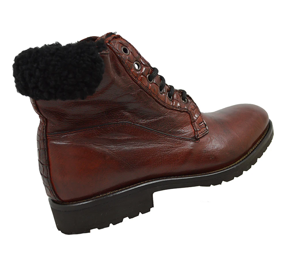Great for the fall/winter, this high boot features makes foot comfort and warmth. Traditional rugged construction boot style. Features crocodile skin on the tongue, lace area, and back heel. For added comfort and warmth you will find shearling on inside of boot shaft and tongue down to the tip of the toes.