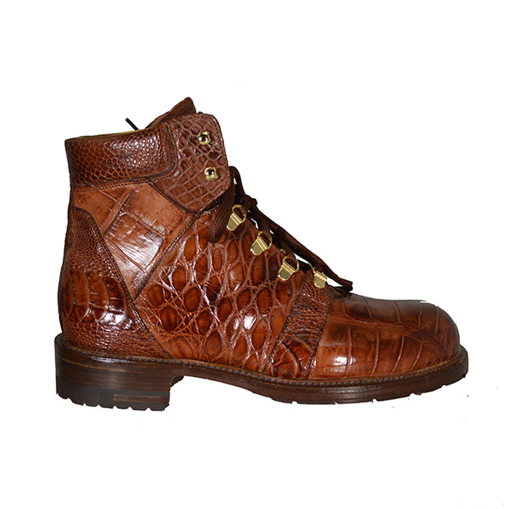 Mauri high top hiker style boots with hand painted alligator skin with some ostrich leg detailing on back heel foxing. Gold hardware laces sets off each of these 3 tones beautifully. Rugged croc print bottom. Colors available exclusively on CelliniUomo.com