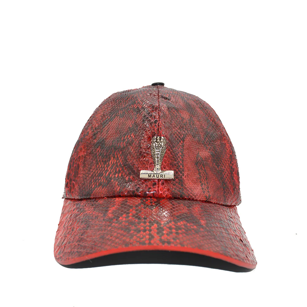 Mauri natural colored genuine python snap back cap. Mauri sinature hardware on front. Adjustable snap back on rear. Black ostrich bottom brim. Made in Italy. One size fits most.