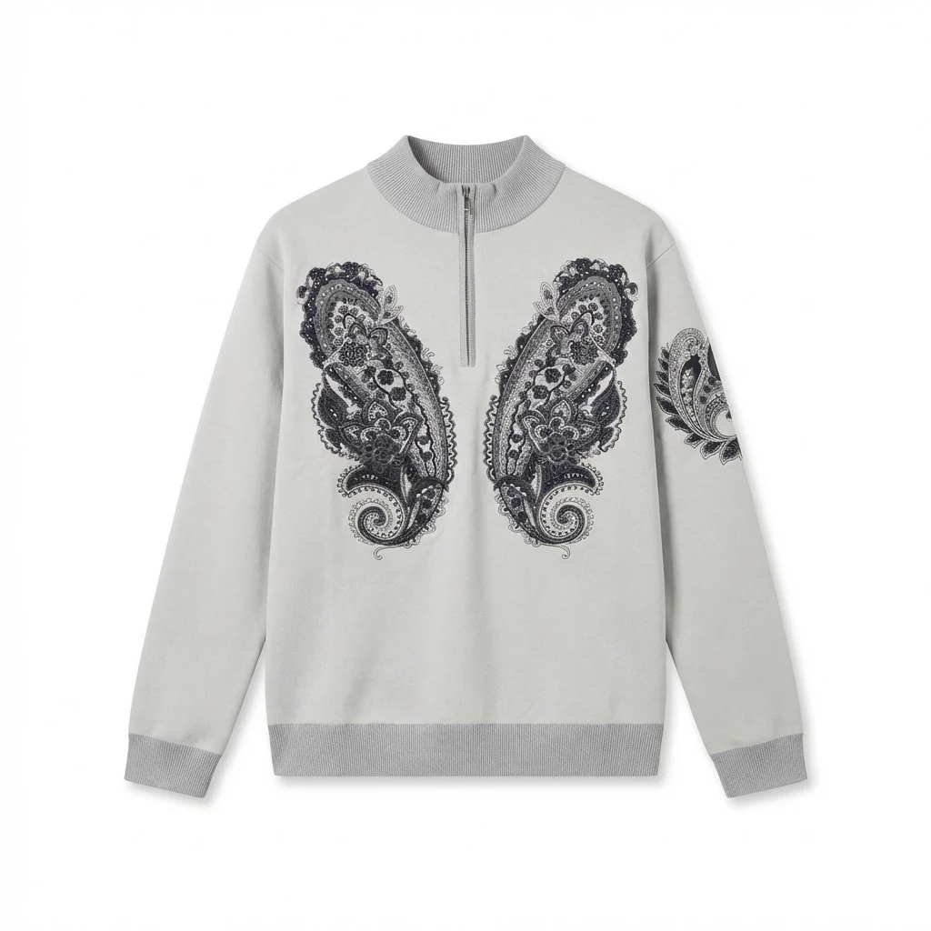 Prestige paisley emborided zip sweater. Black with grey, black, and white embroidery design or white with gray.