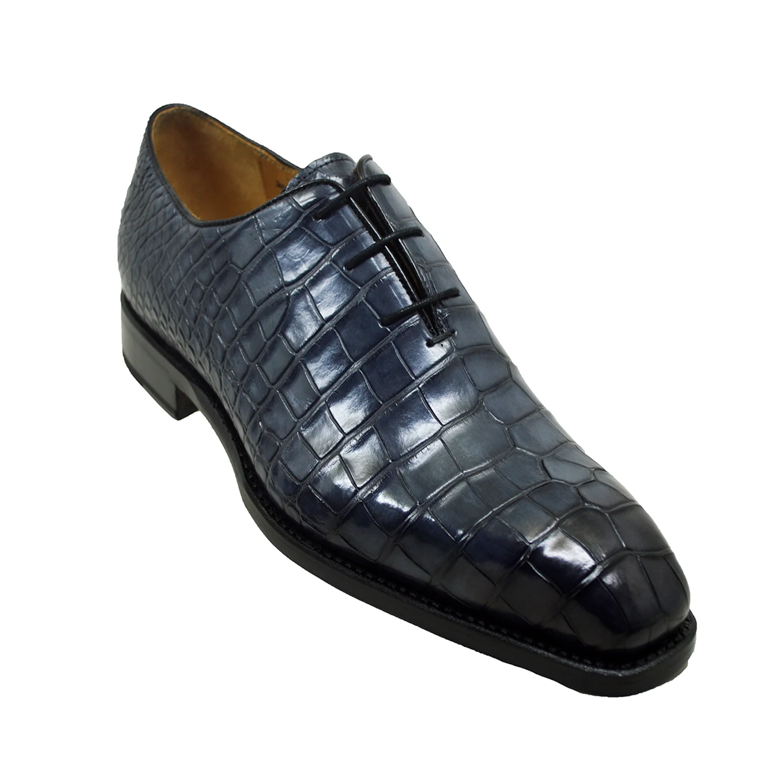 Sheriff Collection oxford style lace up dress shoe. Made in one piece whole cut beautiful authentic alligator leather, with leather interior. Seamless! You wont find any extra stitching or cuts on this shoe; one piece alligator cut precisely to give it a clean, smooth, endless look. Black bottom, real leather Goodyear welt stitch bottom for longevity. Beauty of the shoe comes in the one piece leather that shoes know upper stitch.