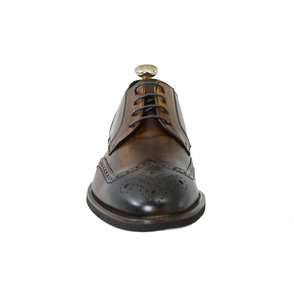 Calzoleria Toscana has become a leader in high quality, high fashion, Italian footwear. Toscana style H202 features a wingtip lace up design with brogue perforations on toe. Hand painted leather with burnishing on toe. Light weight, durable rubber, and comfortable sole makes this any occasion shoe perfect.